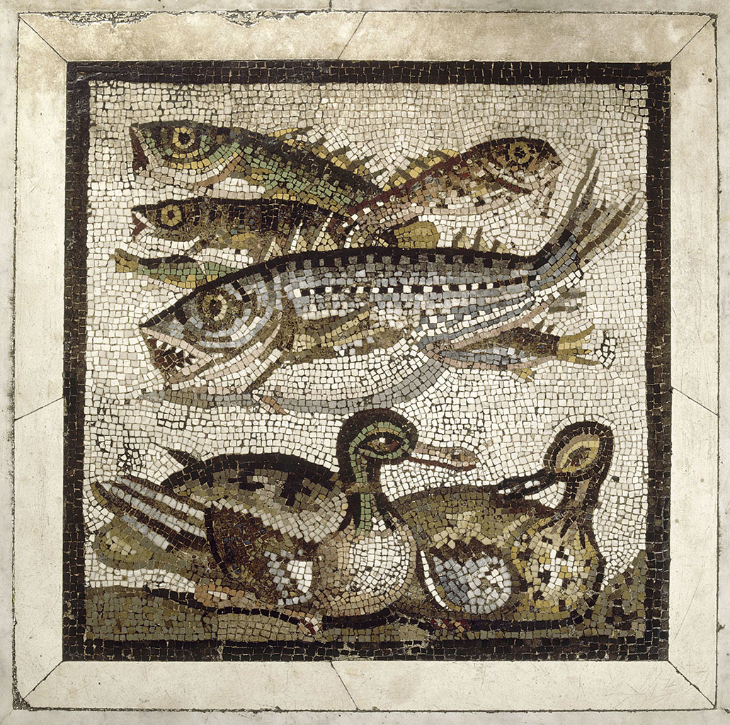 Œuvre reproduite : Mosaïque aux poissons et canards, 1er siècle AP J.C. Hauteur : 30 cm Largeur : 30 cm